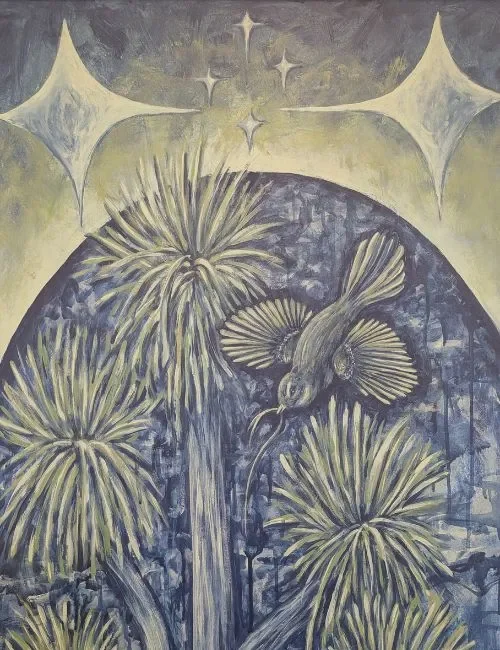 The arch above the tī kōuka tree seems to turn the work into a portal, solidified by the inclusion of the Southern Cross (Crux) constellation. Māhutonga, known by eight different names in Te Reo Māori, is widely known as a navigation aid and is thought of as an ‘anchor’ to the waka that is the Milky Way (Te Ikaroa). Spiritually, I am told it is viewed by some to be a portal through which people have passed to enter this current reality.