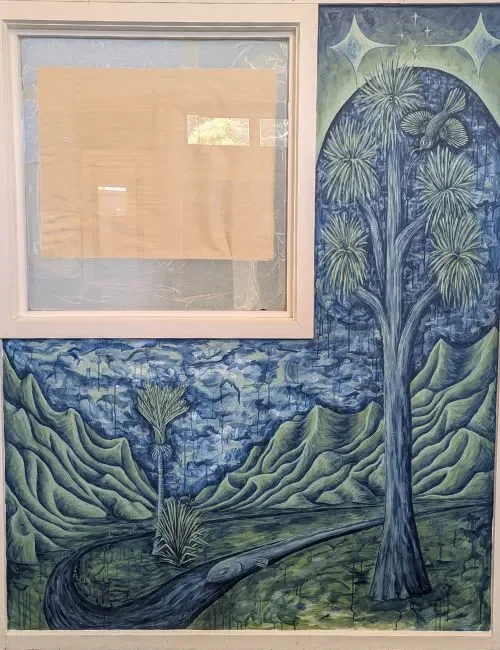 Leaning on the neighbouring Ōtākaro river, this work fosters an otherworldly take on the classic Aotearoa landscape. Encompassing the feeling of hot summer winds, such as the notorious nor’west winds and arches of Ōtautahi, this landscape holds nostalgia at its core. Aptly described as “the feeling you get after watching a really good movie, when the world feels surreal”, there is a certain warp to the familiar. The tuna stretches into the distance, merging with the awa that is playful with perspective, as the maunga ebbs and flows like waves. The plants incorporated here - nīkau palm, tī kōuka, and harakeke, were chosen for their common thread of fibre - each holds their own importance within traditional weaving. This felt like a key inclusion for a work situated on a campus that weaves together many different organisations for an overarching kaupapa of climate action and environmental care and protection.